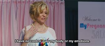 “Kom maar zoveel bij als je wil, schatje, zolang je twee weken na de geboorte terug 55kg weegt is het goed.” (Ik heb in geen jaaaaren 55kg gewogen, spast. En twee weken? Ik zoek een adoptievader als je ooit nog zoiets zegt.)